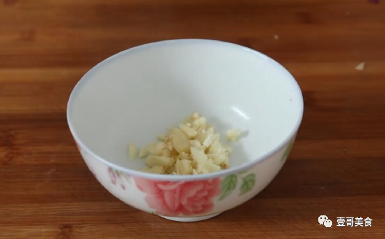第四步:接下来准备适量的大蒜,然后先用手把大蒜的外衣剥掉,再放到厨房的流水下面冲洗一遍,接着就把冲洗干净的大蒜放在案板上面,先用刀背把大蒜拍碎,再剁成蒜末。最后把剁好的蒜末,装在干净的小碗中备用。