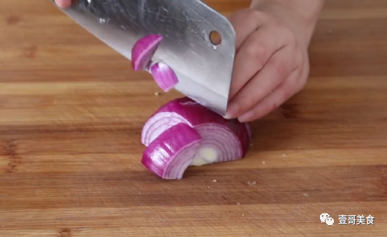 第二步:接下来准备适量的洋葱,然后先把洋葱放在大碗里面,跟着就往大碗里面倒入适量的清水和一勺食盐,把洋葱清洗干净。接着就把清洗干净的洋葱放在案板上,用刀切成小块。最后把切好的洋葱块和黄瓜块装在一起备用。