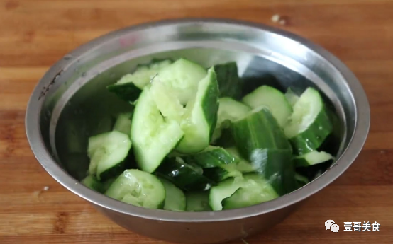 第一步:首先准备一根黄瓜,然后先把准备好的黄瓜放在大碗中,跟着就往大碗中倒入适量的清水和一勺食盐,把黄瓜的表面清洗干净。接着就把清洗干净的黄瓜放在案板上去掉头尾,先用刀拍碎,再切成小块。最后切好后就装在盘中备用。