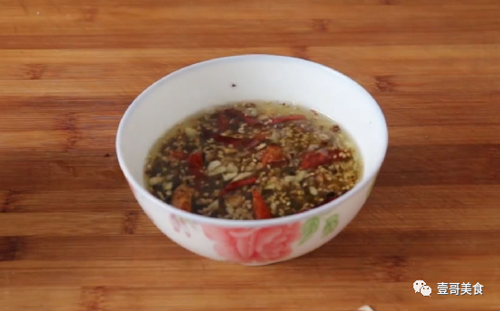 第五步:接下来再准备适量的干净的干辣椒,然后用手把干辣椒撕成小段,跟着往小碗中再加入适量的白芝麻,接着再浇上烧好的花椒油。最后再往小碗中加入适量的食用盐、白糖、陈醋、生抽搅拌均匀,一碗简单的料汁就调好了。