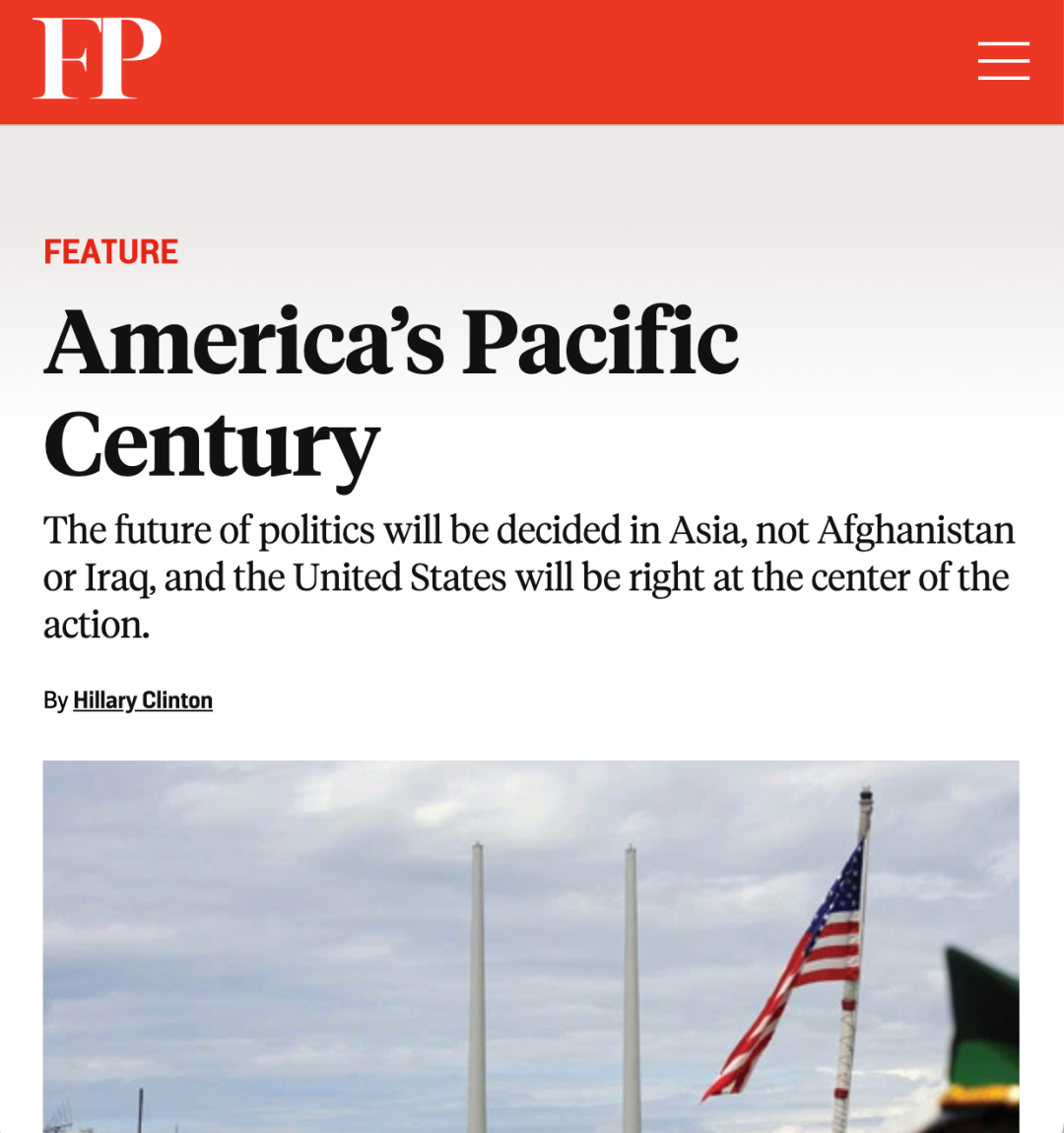 ▎美国前国务卿希拉里·克林顿发表的《美国的太平洋世纪》在奥巴马政府时期,参与设计和执行“转向印太”战略的坎贝尔可以说是得意的,也可以说是失意的。