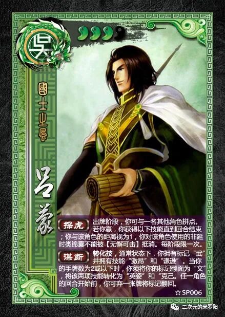 简述:转化技只有当年随桌游志赠送的sp吕蒙拥有,虽然名称与转换技非常像,但是效果差异很大。不分“阴”“阳”,而是根据吕蒙手牌数的不同而拥有不同效果。平常状态下,吕蒙拥有“武”标记,拥有“激昂”“谦虚”,而手牌数为2或以下时,标记变为“文”,拥有的技能也变为“英姿”和“克己”。