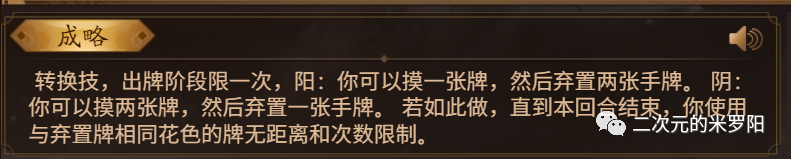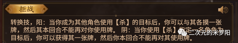 简述:转换技,通常拥有“阴”“阳”两个效果,两个效果并不能同时发动,而是必须交替发动。例如你发动“阳”效果后,技能会自动转换为“阴”效果,如果你不发动“阴”效果,是无法再次发动“阳”效果的。转换技丰富了技能内容,但是也带来了相应的限制。