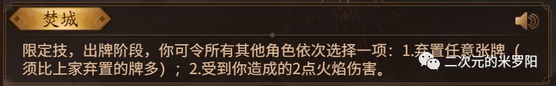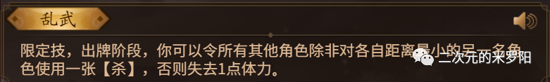 简述:整局游戏只能发动一次的技能。限定技由于发动次数少,所以效果通常都比较强大,往往可以在一定程度上扭转战局。
