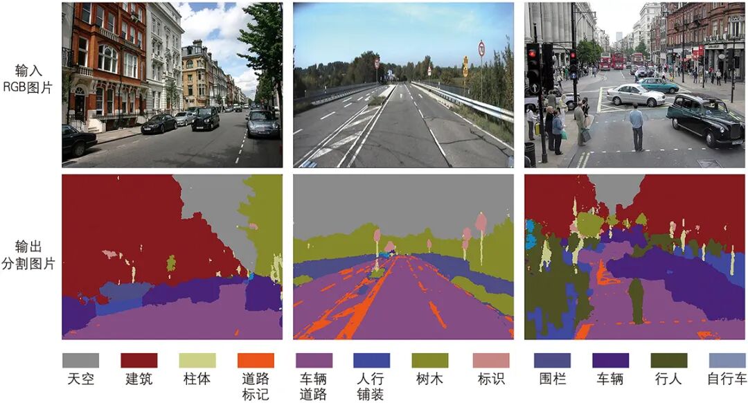 ③ SegNet是卷积神经网络的算法之一,可以对道路、车行道、人行道、建筑、天空、树木、车辆、自行车、行人、柱体、围栏、标识共12种街道要素进行识别。