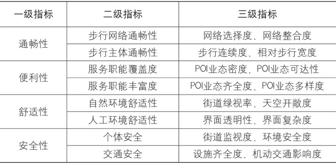 步行指数以二维平面视角测度步行性,侧重街道设施布局和多样性,但忽略了街道空间环境对步行性的影响。新近的研究构建了涵盖街道通畅性、便利性、舒适性、安全性层面的街道可步行性测度体系(表3),分别对应街道平面属性、设施服务水平、街道形态构成要素和使用者主观感受,提出了基于三维空间视角的街道步行性量化方法[27]。