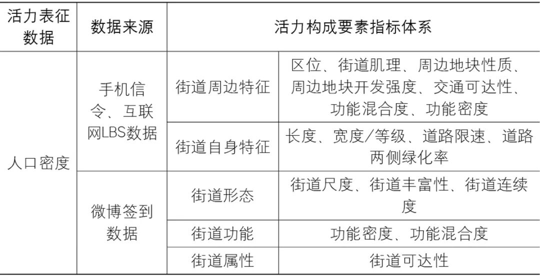 典型研究是通过手机信令、微博签到或互联网LBS获取人口密度数据,构建包含街道自身与周边特征的量化指标体系,通过多元线性回归发现区位、功能密度、功能混合度等与街道活力的影响关系[28][29](表4)。