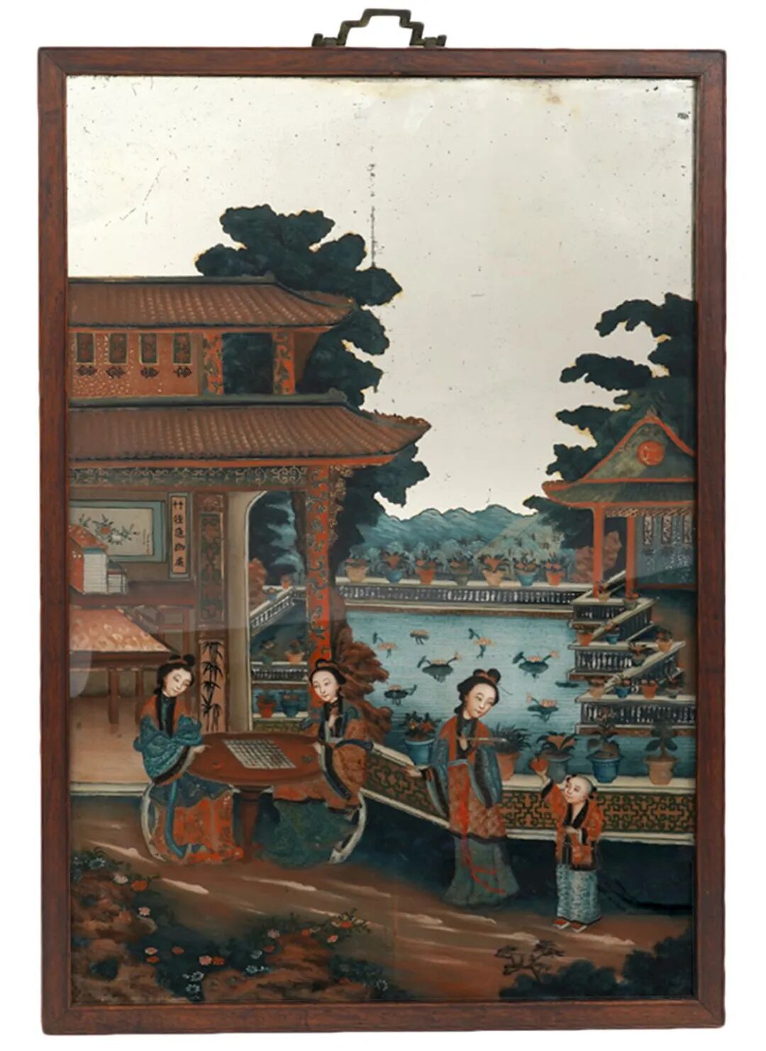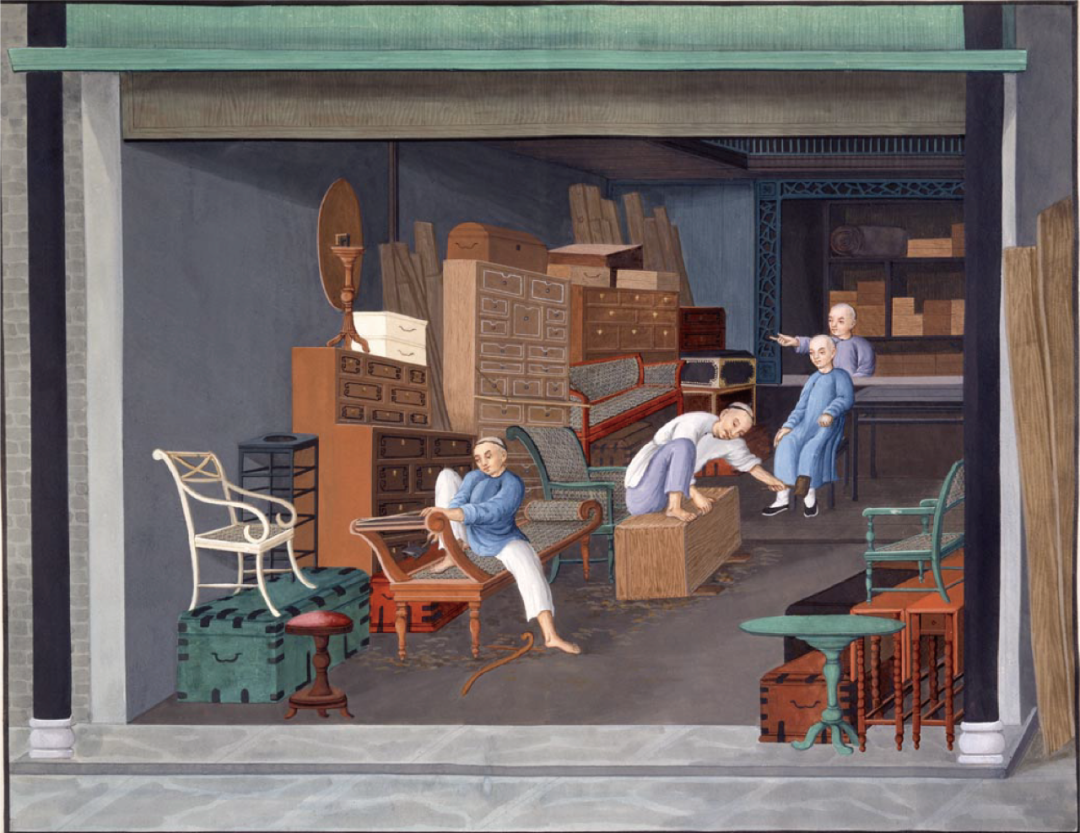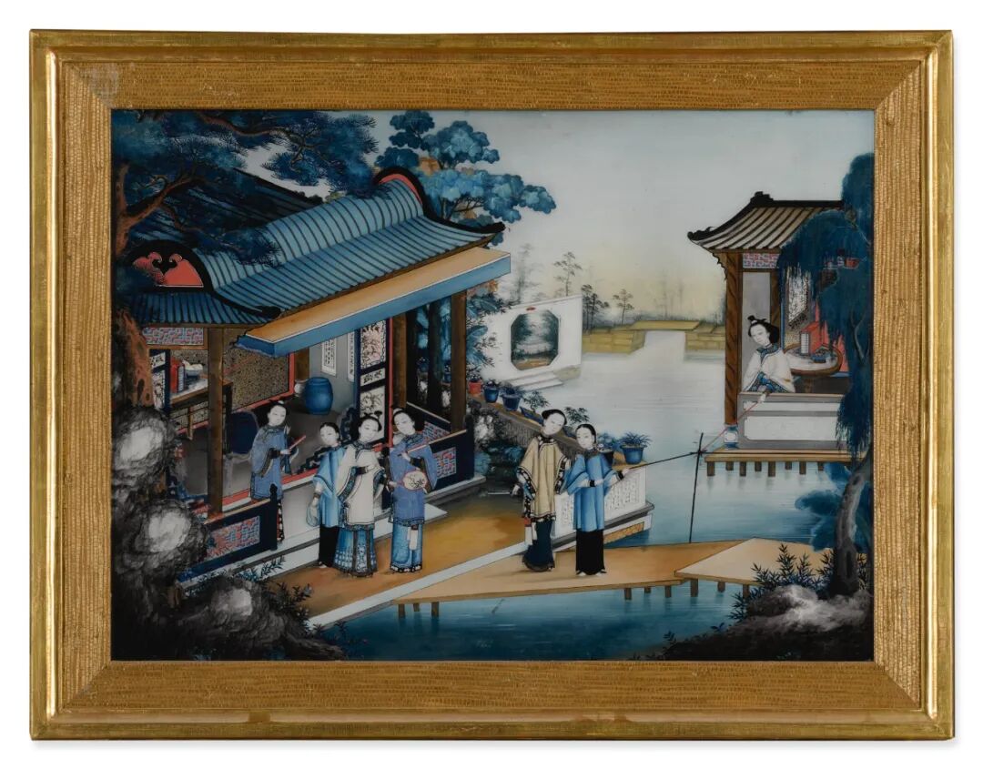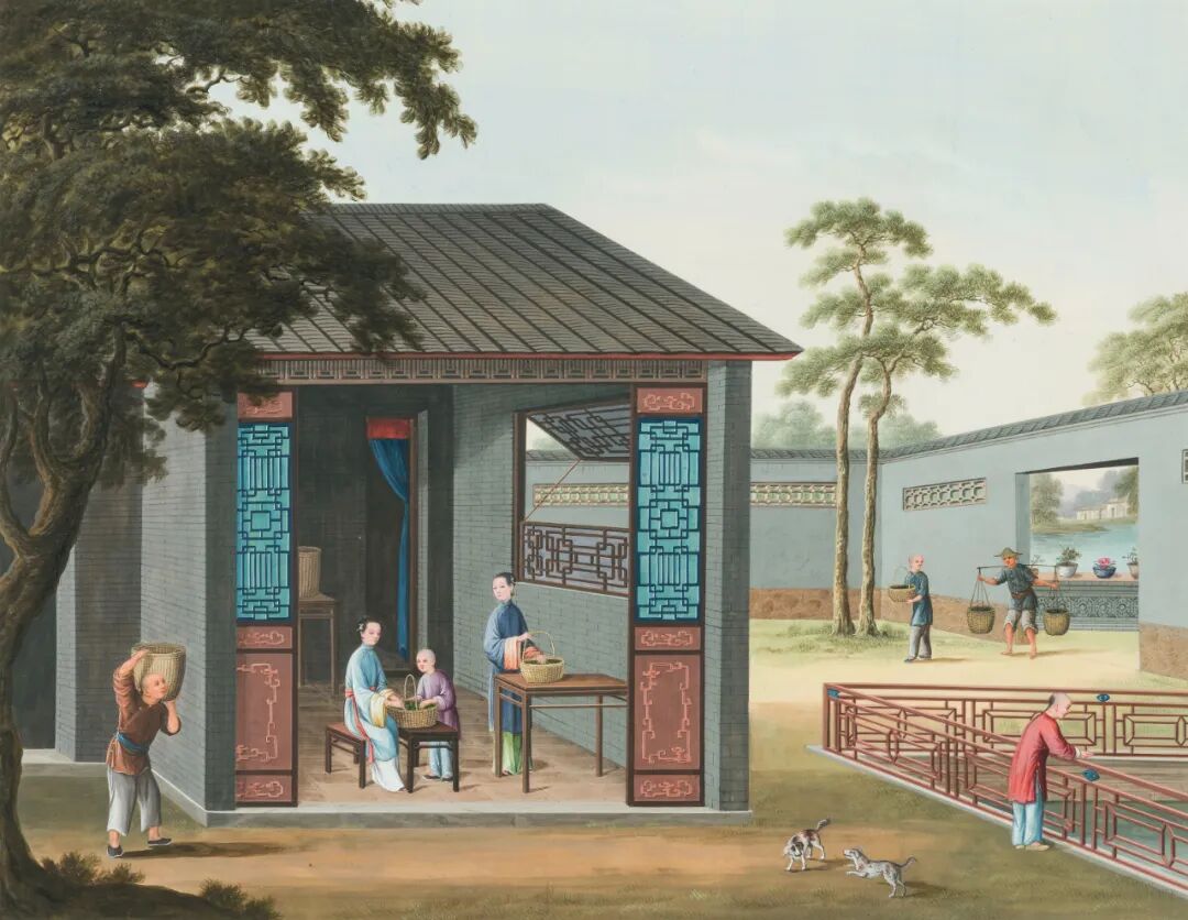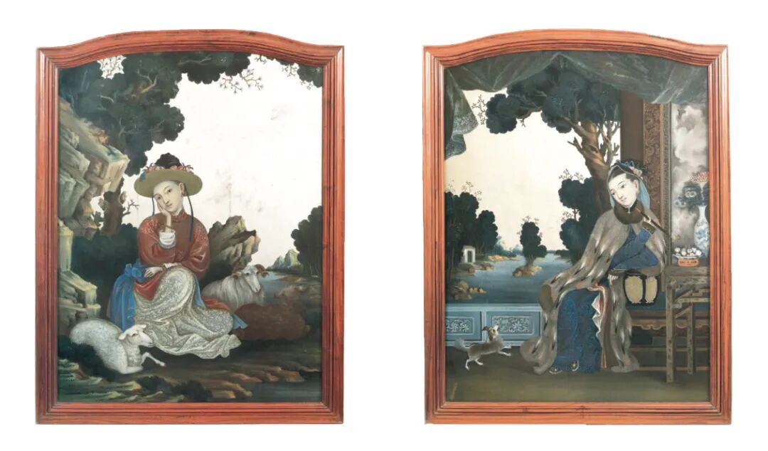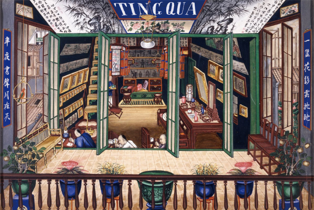 为了迎合西方人的喜好,外销画师会大量使用中国风的背景和元素来装饰画面。
