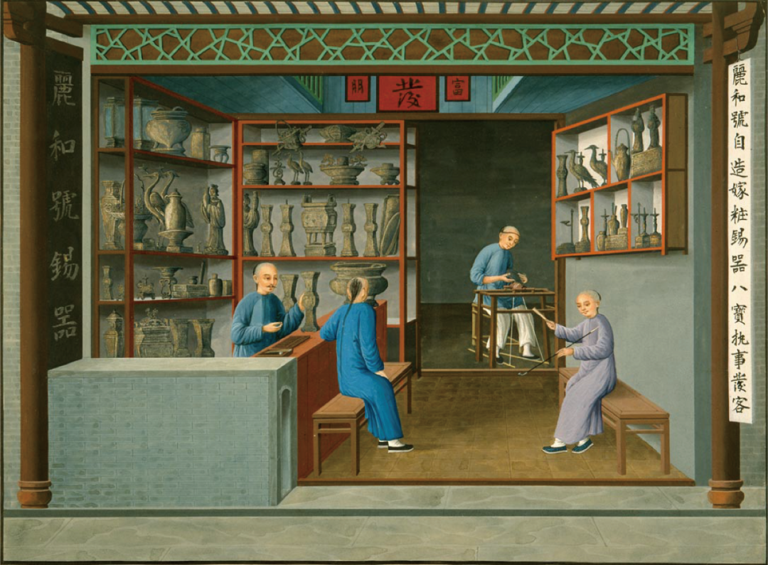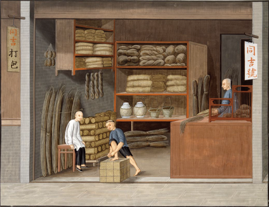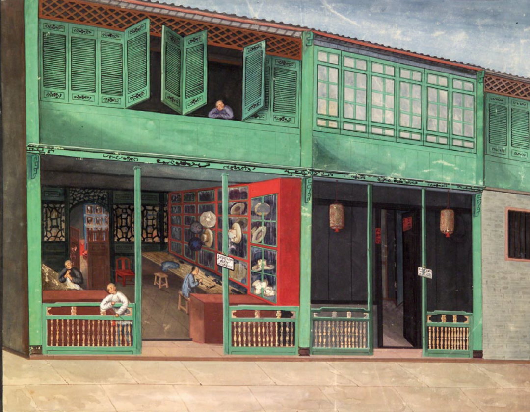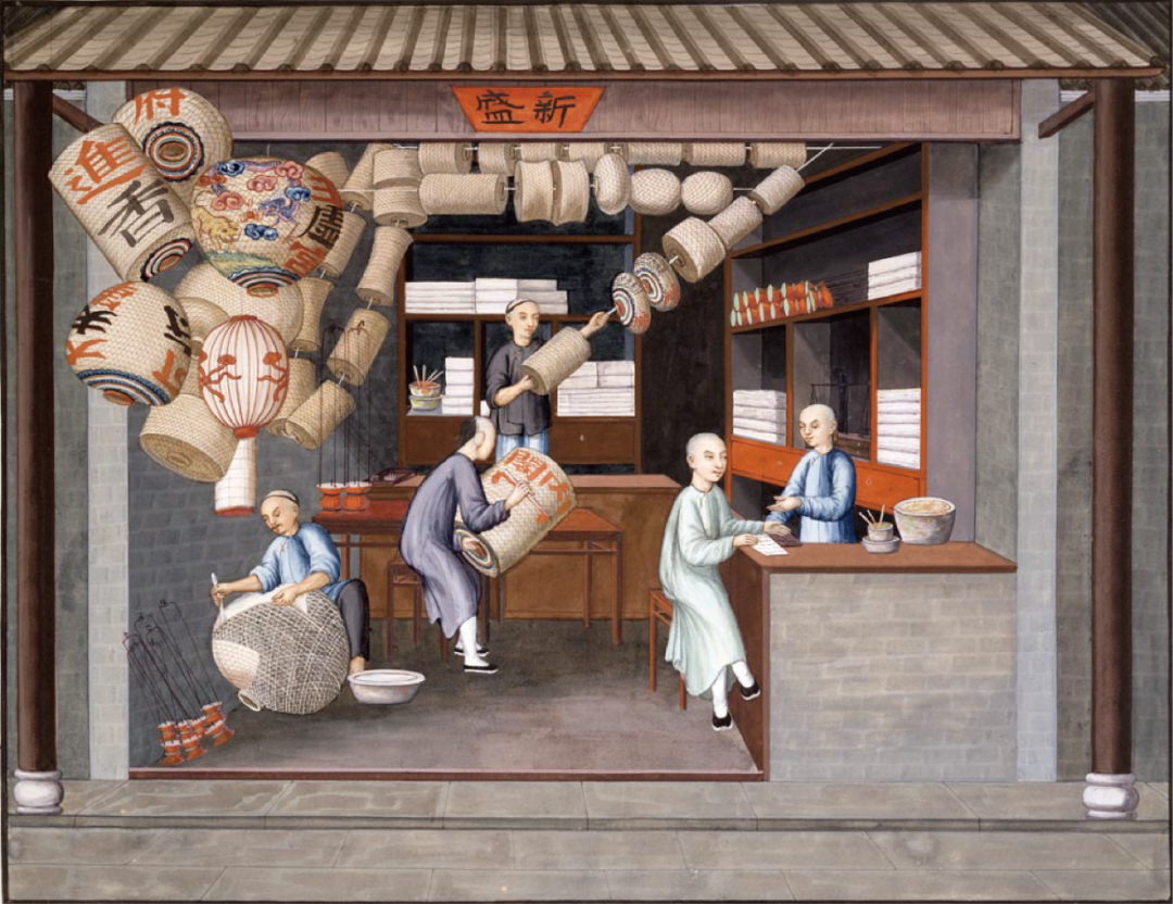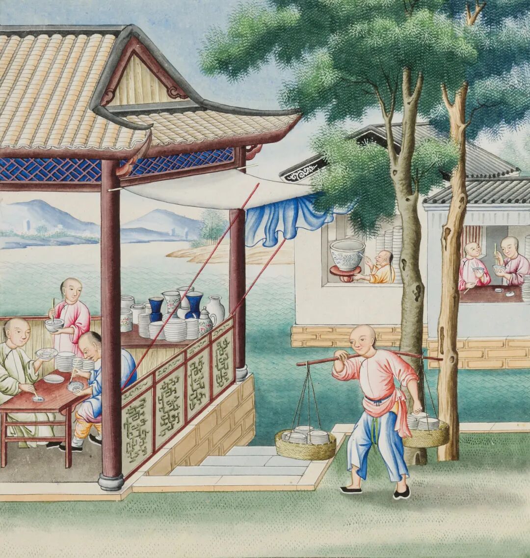 为了迎合西方人的喜好,外销画师会大量使用中国风的背景和元素来装饰画面。