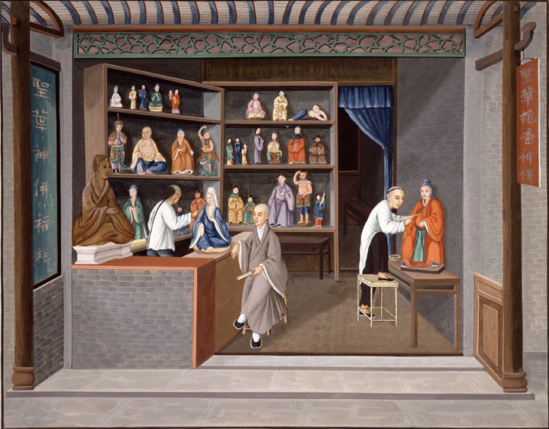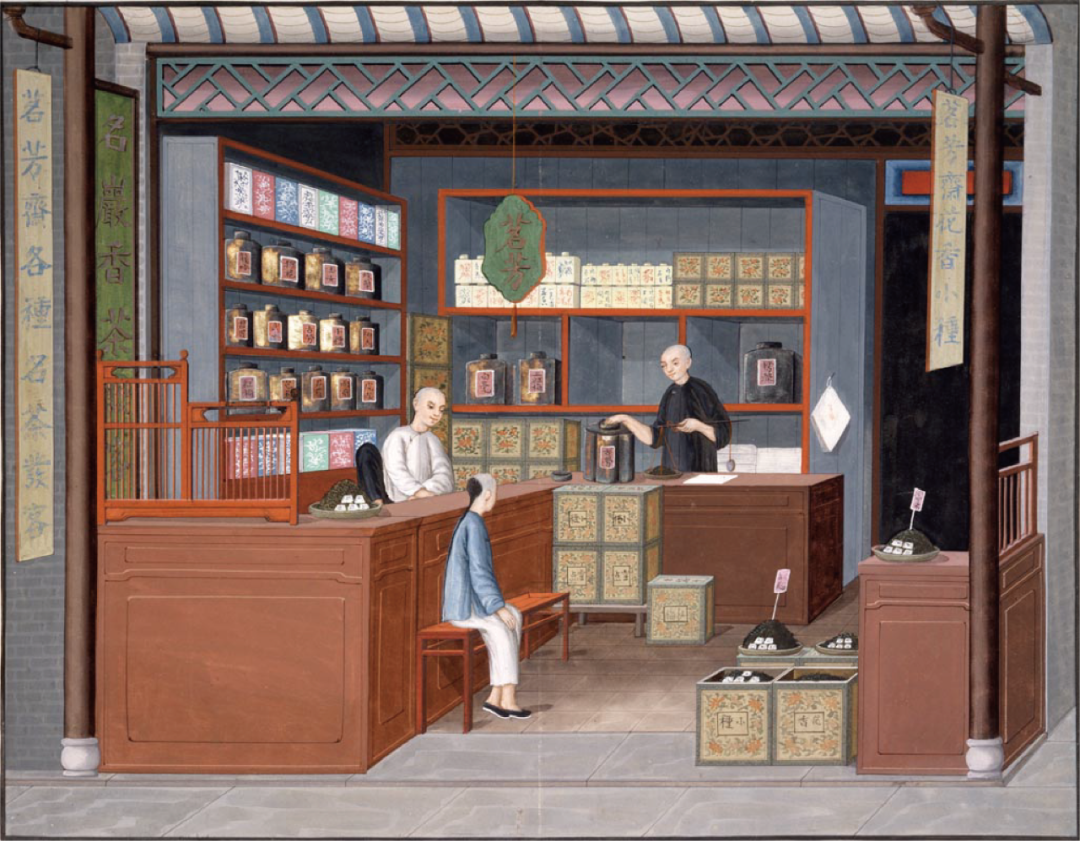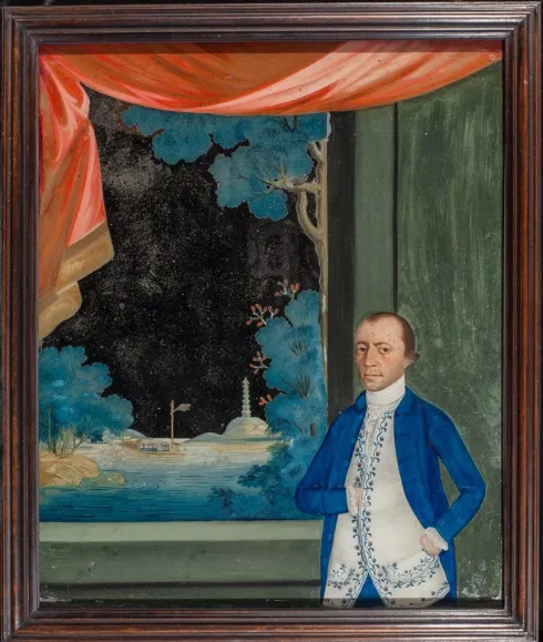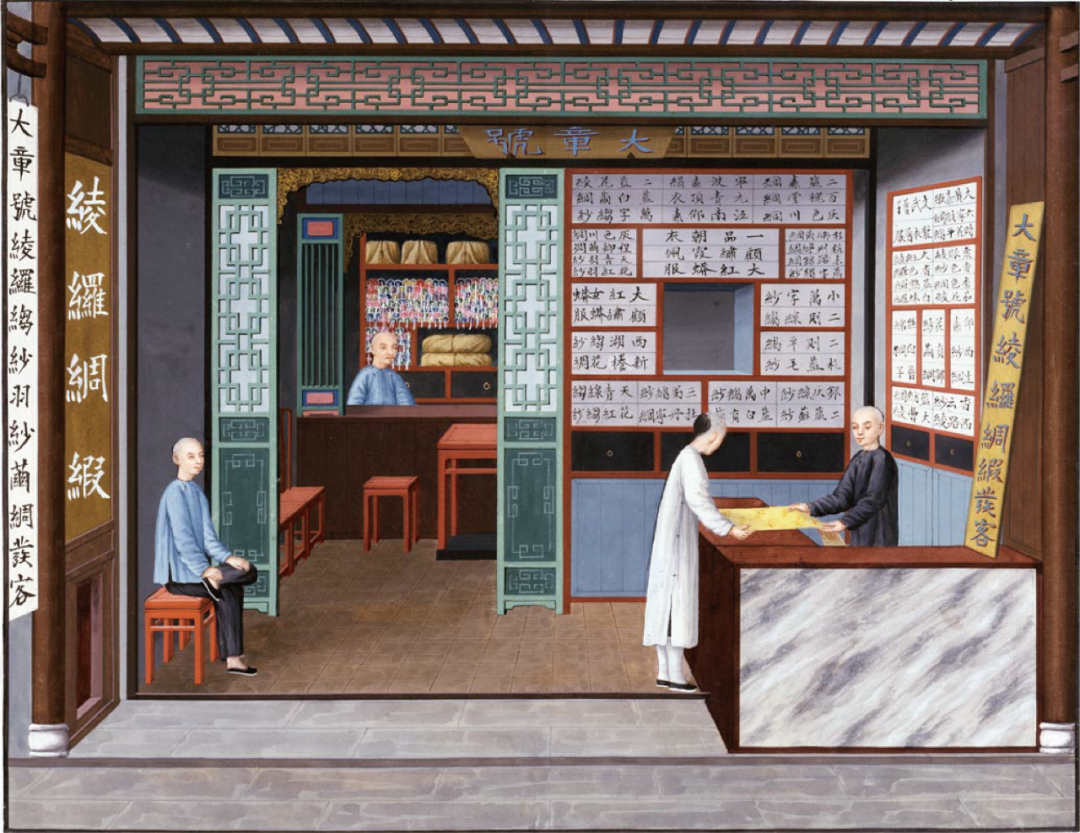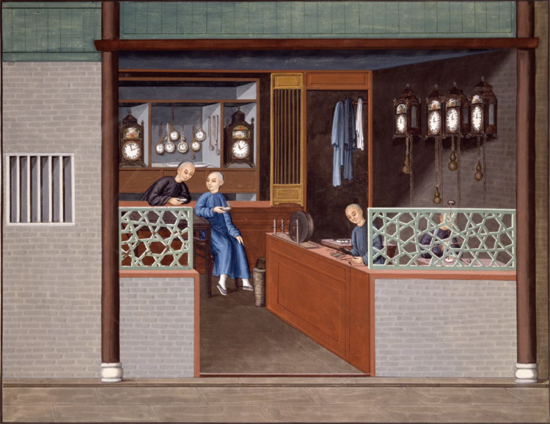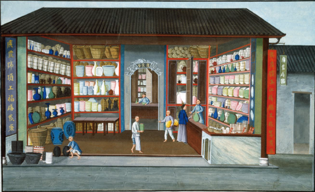 为了迎合西方人的喜好,外销画师会大量使用中国风的背景和元素来装饰画面。