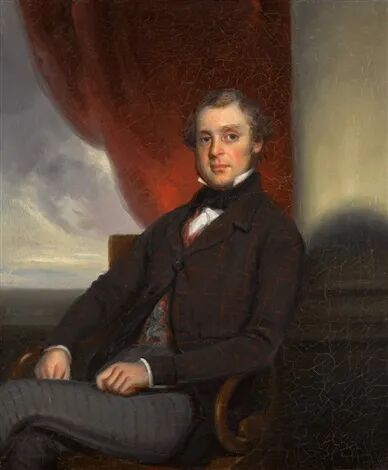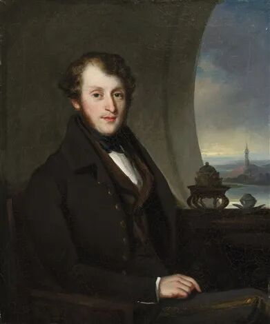 Left: Lamqua / A Western Merchant, seated small half length, by a Moon Window, with a view to a Pagoda beyondRight: Lamqua / Portrait of a young man, three-quarter-length, seated before a red curtain, a landscape beyond