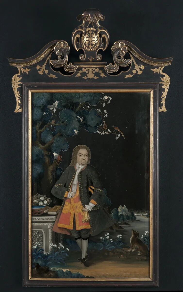 从瑞典东印度公司的商人 John Pike 的肖像玻璃画可见,除了他的姿势造型和当时的欧洲肖像画一样外,画面其他部分都是用中国元素来装饰,比如中国的松树、喜鹊、书籍等等。