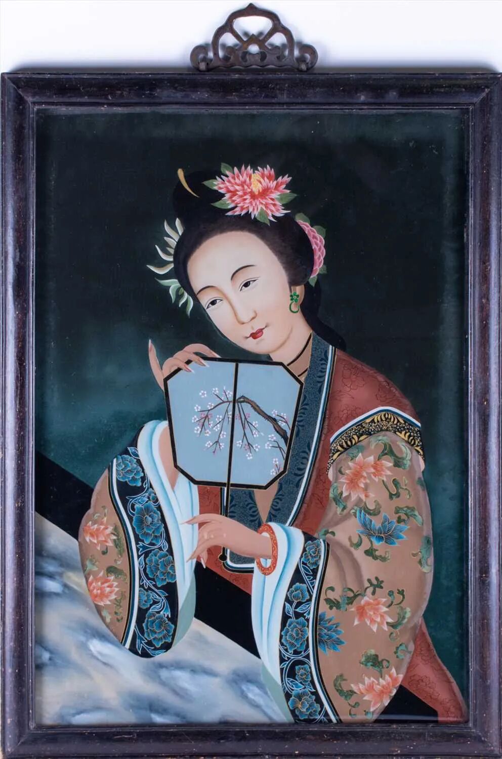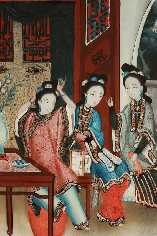 外销画师为了满足西方审美而绘的美人图,突出了东方女性细长的双眼、樱桃的小嘴、华丽的衣着配饰,住在精致的庭院房间内,充满了浓浓的东方情调。