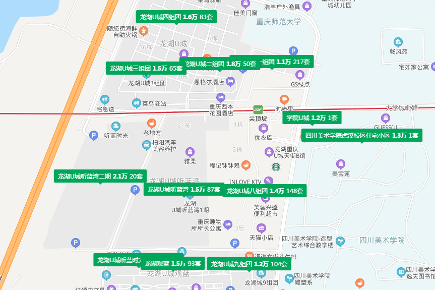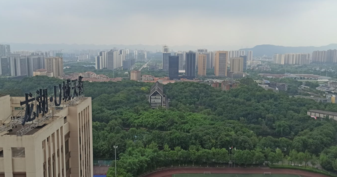 原来,U城天街对面是鼎鼎大名的四川美术学院,从空中看过去里面的绿化就像个大公园一样,这边的居住密度比较小,空气确实很清新;