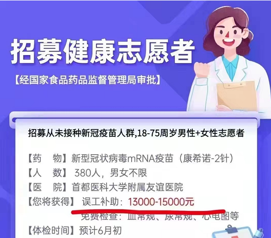 北京友谊医院也传出招募康希诺mRNA新冠疫苗受试者的消息,共需招募380人,给出的“误工补助”是每人13000-15000元。健识局向友谊医院确认了消息的真实性。