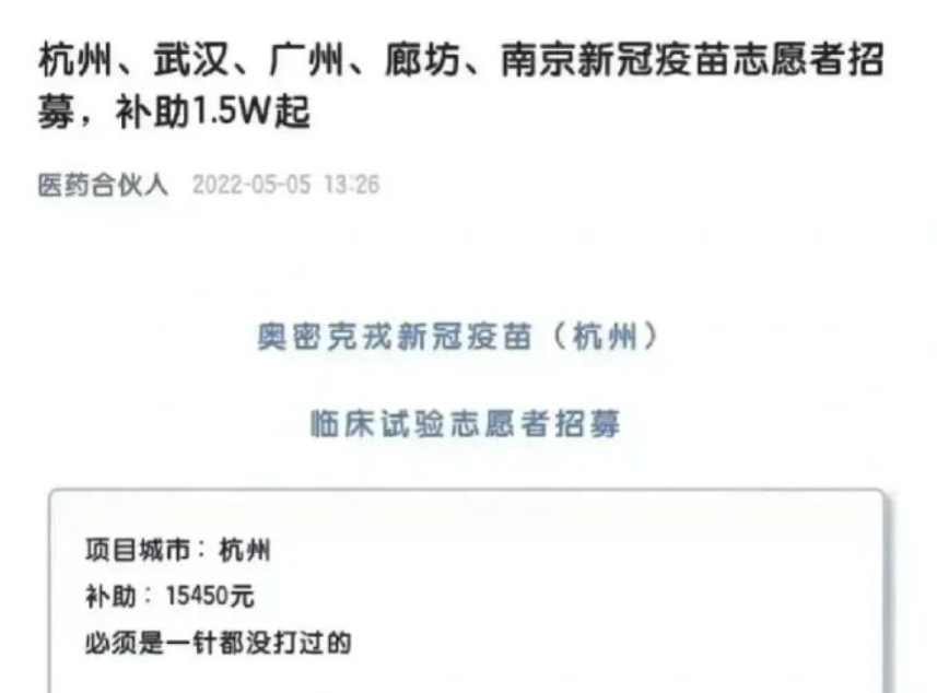 4月末,国药集团研发的针对奥密克戎变异株的新冠灭活疫苗获批临床,相关临床试验于5月初在树兰(杭州)医院启动。朋友圈里立刻传出了招募临床试验志愿者的消息,最受关注的是受试者的补贴:每人15450元。