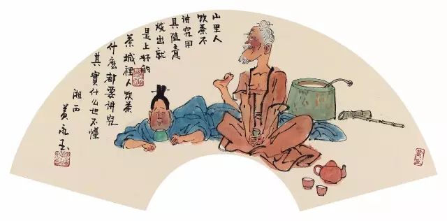 在黄永玉的茶画中,我们总能看到一份偷着乐的情趣,画中人往往因得茶这件小到不能再小的事情而变得喜色难掩,也就是这份微不足道的趣味,叫人看了画,也不禁愉悦起来。人生本就简单,若你把大富大贵、飞黄腾达作为乐趣,那自然乏味,若你把所有的小事都当成乐趣,那自然其乐融融,轻松自在不少。这便是黄永玉画中所谓的“欢喜有理”!