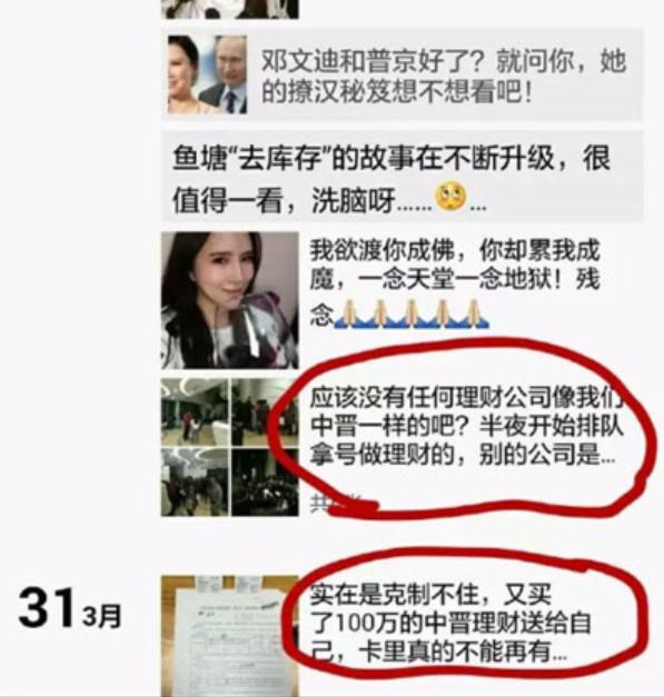 荒唐事往往结奇葩果。 2016年3月底,一个名叫程明的女子在朋友圈的炫富,引发媒体聚焦,事情发酵,舆论一哄而上指责,进而警方调查、挖出集资诈骗规模400亿余元的中晋集团。案发时,中晋集团未兑付金额48亿余元,涉及1.2万余名参与人。06