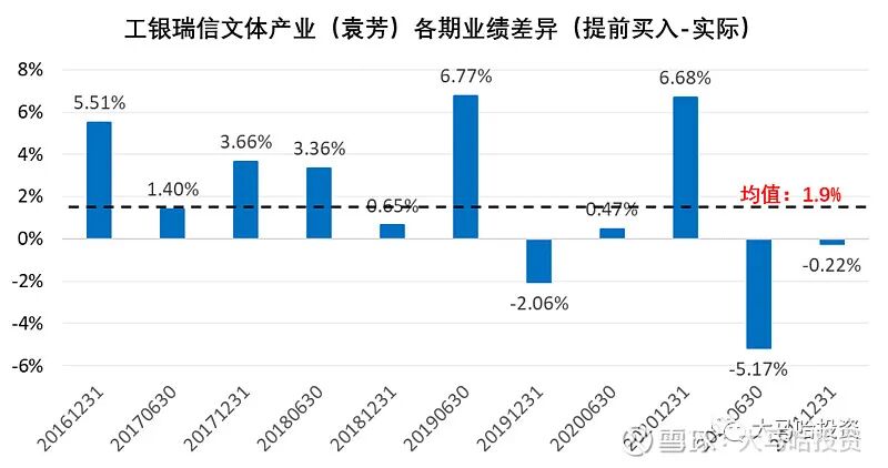 一些朋友可能会认为,换手率高的交易型选手会呈现出非常强的右侧风格,其实并不是,我们看看工银瑞信文体产业(袁芳)的数据(具体如下图),各期业绩差异均值为1.9%,略偏右侧一点,总体还算好。