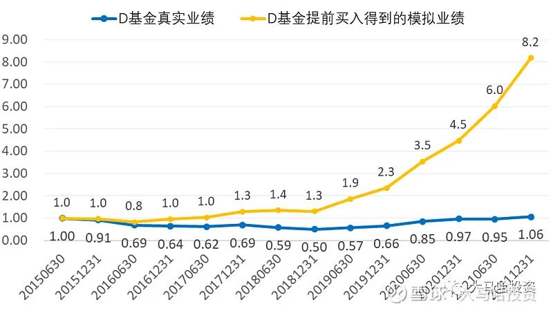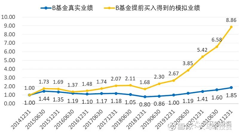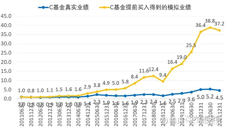 这个数据是惊人的,换个维度,我们假定该基金经理提前最多半年买入他的那些持仓,即将基金期末股票持仓在过去半年期间的涨跌幅作为其业绩,那么真实业绩与提前买入得到的模拟业绩对比是下图这样的: