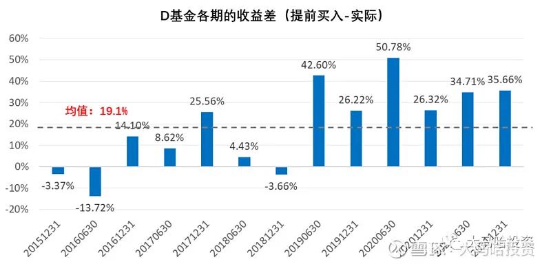 D基金经理各期收益差均值为19.1%,如果D基金经理能提前半年买入他持有的那些股票,他足可以乌鸡变凤凰,持有期间业绩由区区的6%变成惊人的718%...