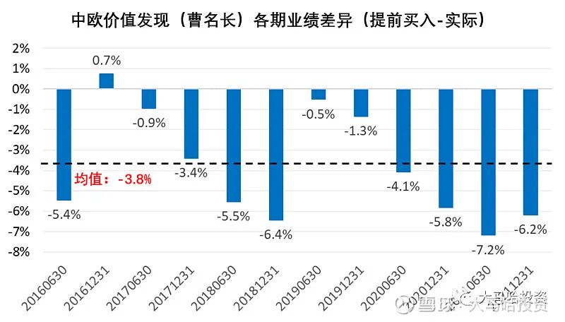 上面我说过,注重估值的基金经理往往是左侧选手,所以我们看看老曹管理的中欧价值发现(具体如下图),各期业绩差异均值为-3.8%,这意味着提前买入他持有的那些股票,收益反而要差不少,这是典型的左侧投资者。