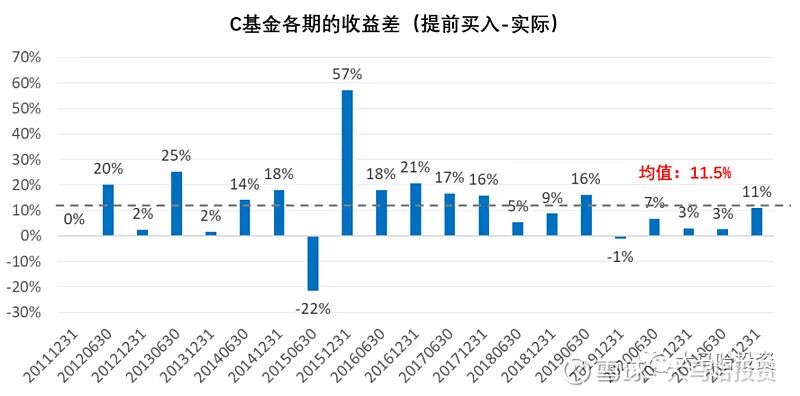 C基金经理各期收益差异均值为11.5%,如果C基金经理能提前最多半年买入他持有的那些股票,那期间业绩将由实际的353%大幅提升至3624%。