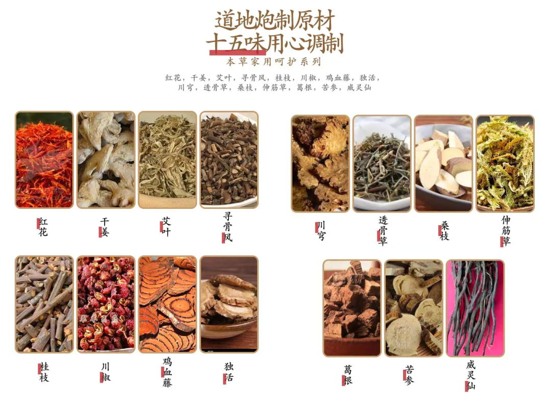 干姜、桂枝、川椒,刺激味觉,更刺激身体,温经通脉,助化阳气,燥湿消痰。艾叶理气血,逐寒湿,让祛寒湿,助阳气的效果更好。寻骨风、独活、透骨草、桑枝、威灵仙,这些名字怪怪的草药呢,则可以祛风除湿,通络止痛。接下来是红花,鸡血藤,川芎。这个小分队,不仅驱外邪,更有疏通气血经脉之用。(红花活血通经,去瘀止痛;鸡血藤补血,活血,通络;川芎活血行气,祛风止痛)最后以葛根解肌退热;发表透诊;苦参清热燥湿;把体内的风、寒、湿、热一起驱赶出去!