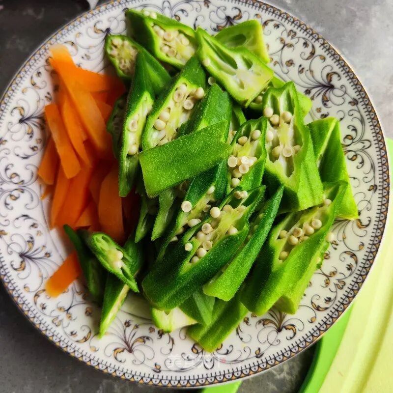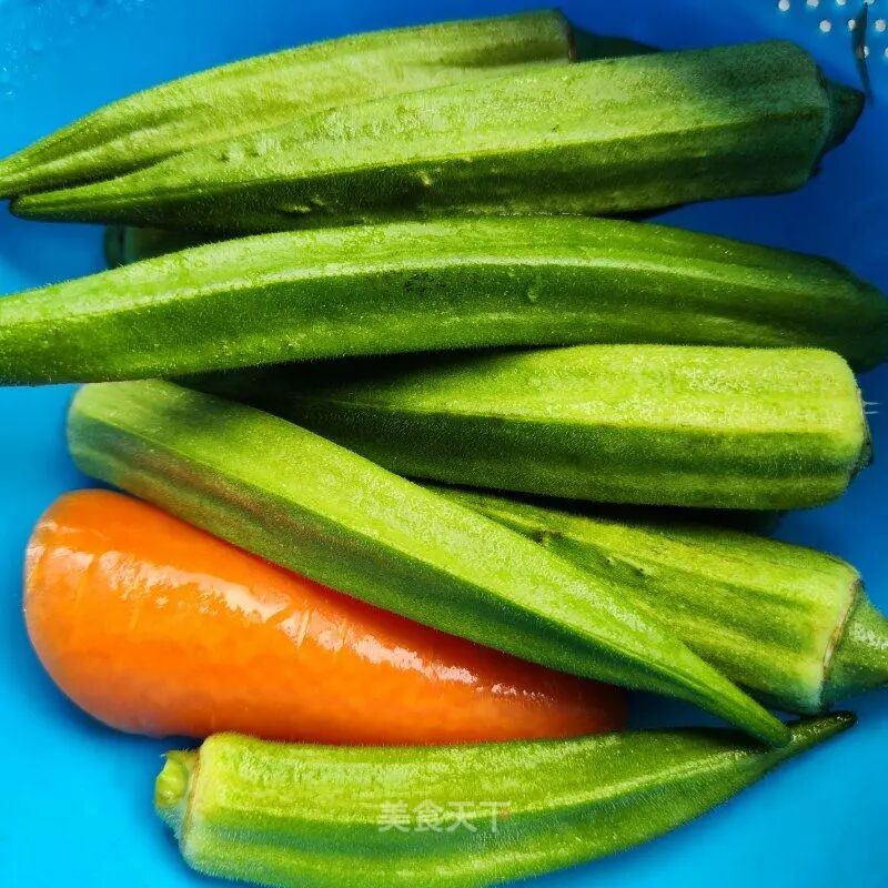 1. 秋葵,胡萝卜洗净备用,胡萝卜改刀切成条状。