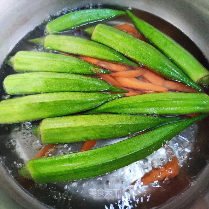 3. 汤锅加水烧开,放入胡萝卜,秋葵加盐焯两分钟,捞出过凉水。