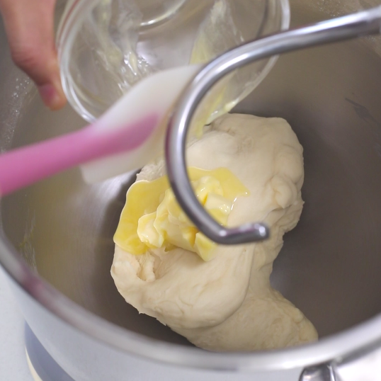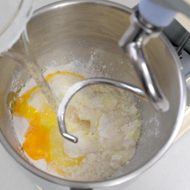 接着制作主面团,将除黄油外所有材料混合,先5档搅拌7分钟。
