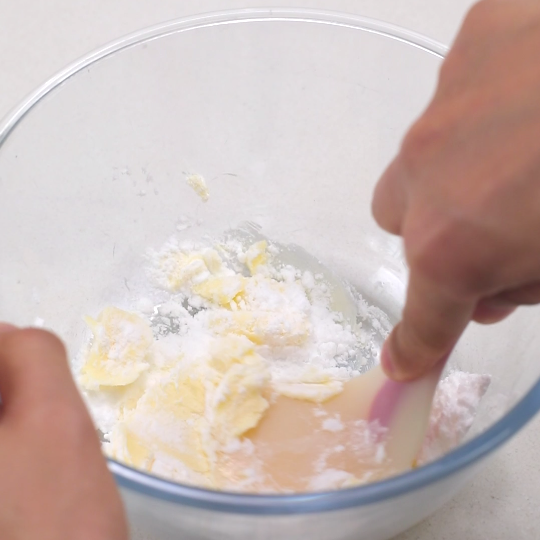 发酵时我们来制作雪芙皮,20g提前软化的黄油,加15g糖粉,稍稍拌匀后。这里必须用糖粉,细砂糖无法溶解,雪芙皮会很粗糙。