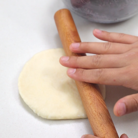接着轻拍面团,稍稍擀薄,四周再拍扁。