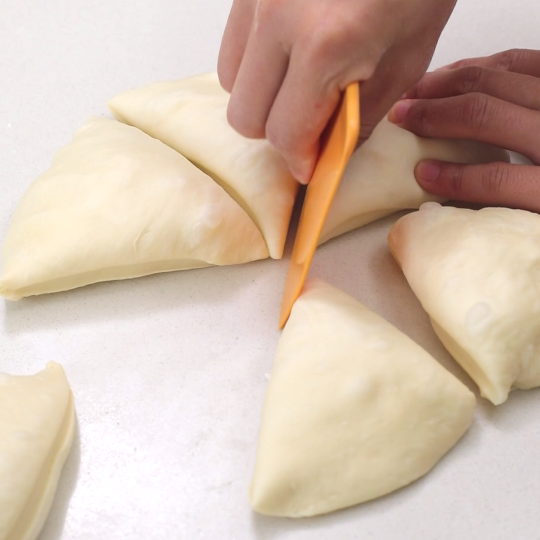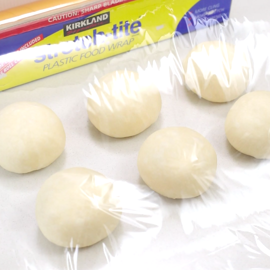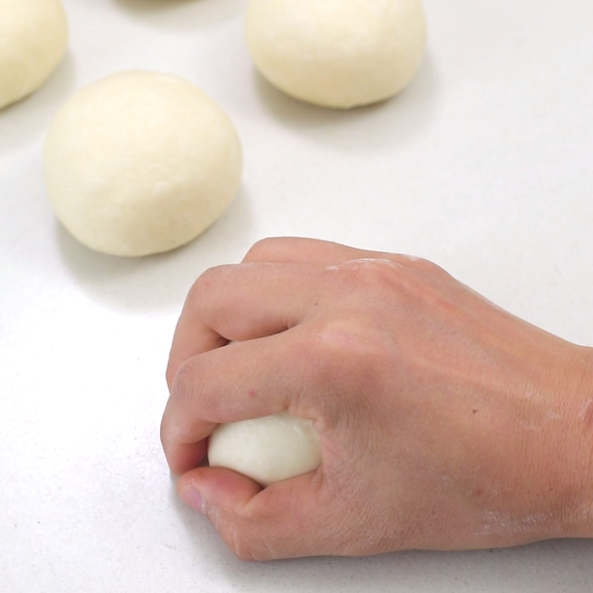 把面团拍扁,四周往底部内收,然后扣住面团将其滚圆。