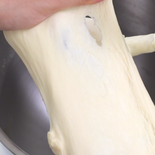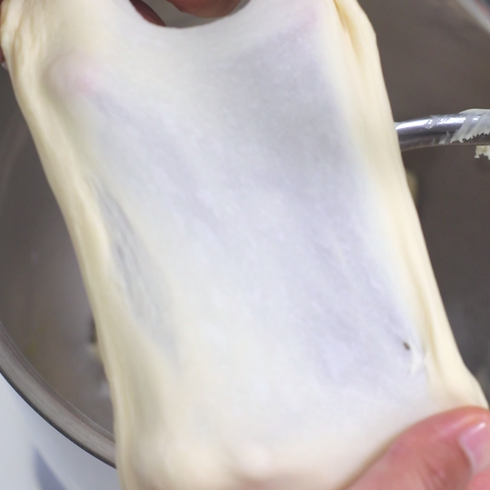 继续5档搅拌8分钟,直到9成筋度,即可以撑开透明面筋,裂口呈光滑状。