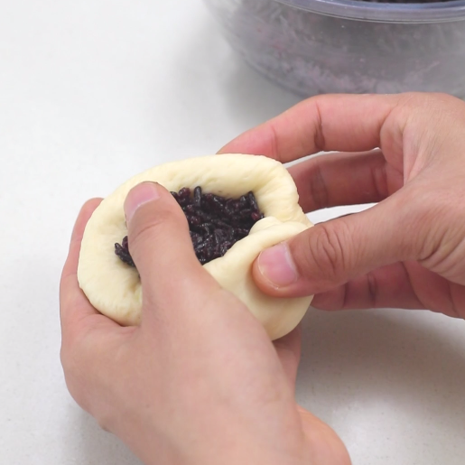 底部翻转朝上,填装30g紫米馅,收口捏紧。如果没有模具,包好就可以直接发酵。