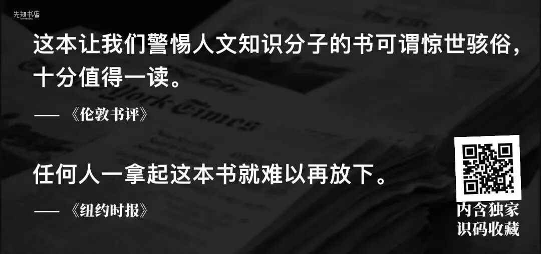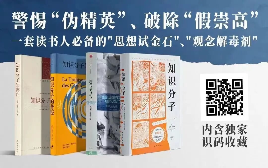 为此,文艺青年联合先知书店诚挚推荐“知识分子四书”:《知识分子的鸦片》《知识分子的背叛》《知识分子与社会》《知识分子》,阅读它们不仅能一眼看穿知识分子们的思想的高下,往往还能帮助大众筛选真正值得阅读的优秀思想,建立一份“思想的黑名单”。其中几本更是一度绝版,无论是个人阅读还是赠予亲朋师友,都是极佳的选择。识别下图二维码,即可一键收藏或购买。