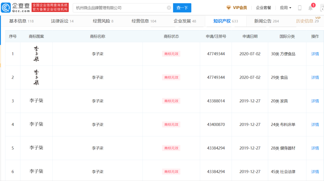 ▲企查查网页上显示,杭州微念品牌管理有限公司所申请的“李子柒”相关商标均被驳回无效。图/企查查网页截图