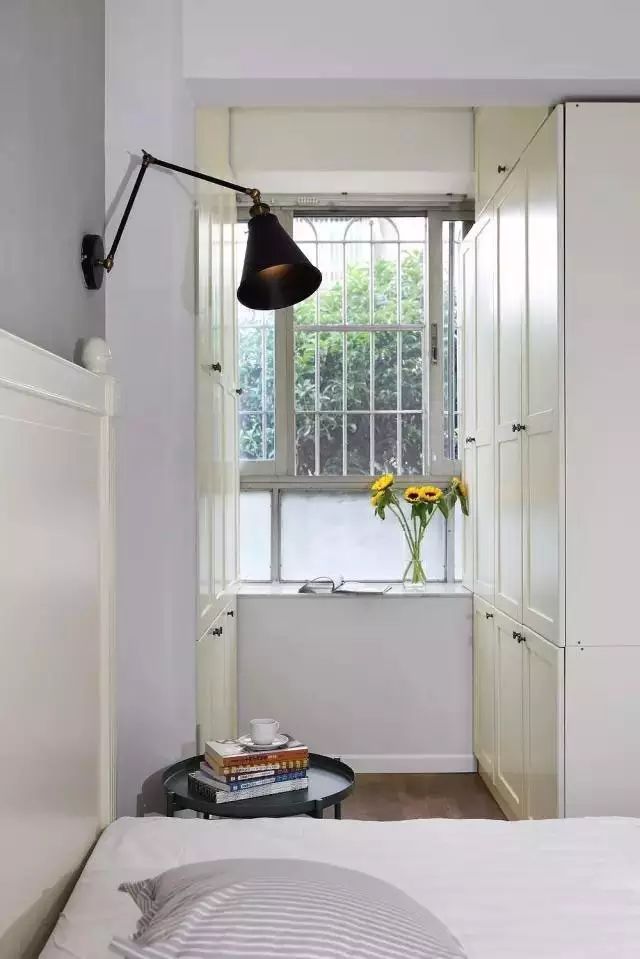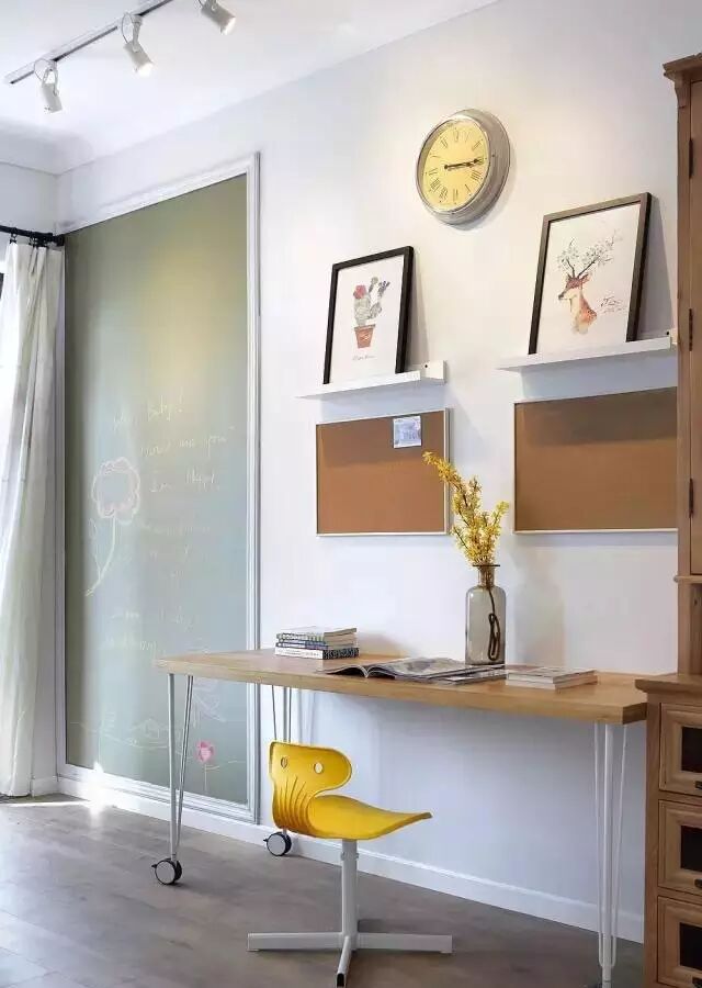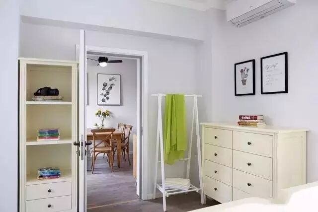 虽然主色调是白色,木质的家具为空间增添温馨感。一侧的斗柜,方便收纳小件饰品,另一侧刚好可以摆放50CM宽的书架。