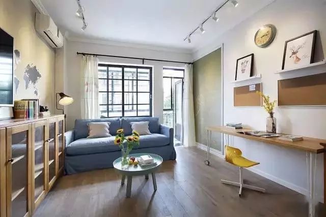 大大的落地窗,通风采光与视觉效果都非常好。浅蓝色沙发,小清新北欧风轻轻吹。