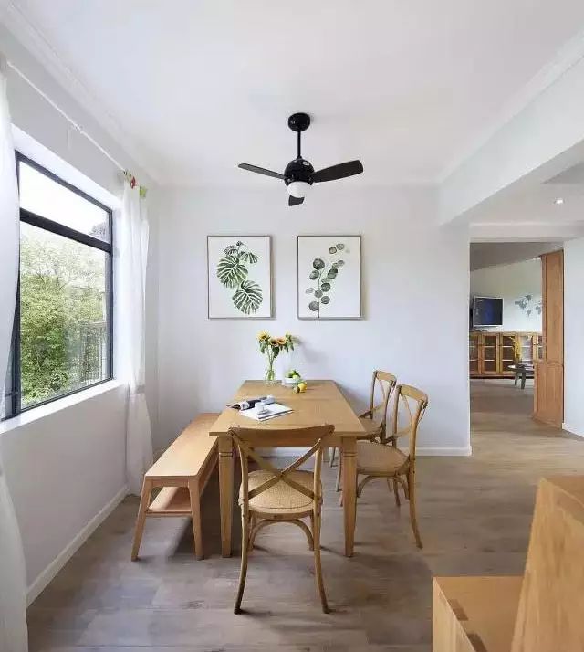 餐厅有一个超实用的风扇灯。独立式的餐厅享受超好的采光,用餐都有好风景相伴。