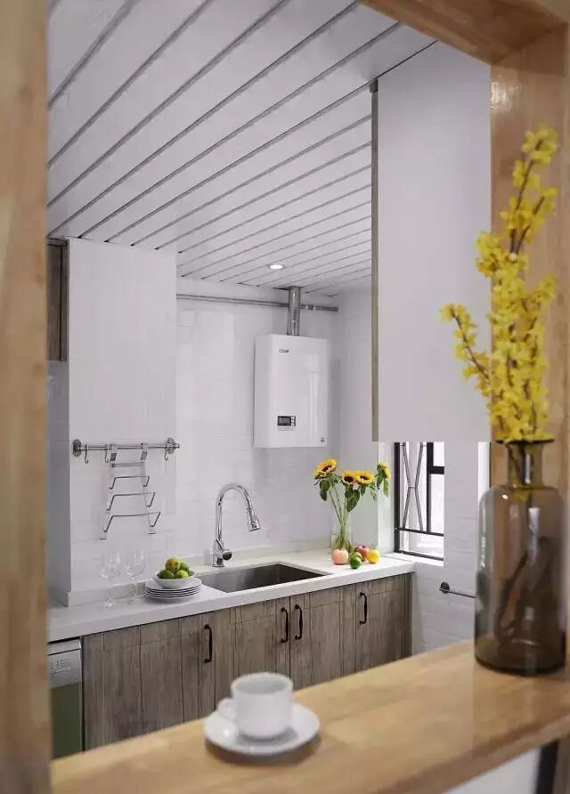 原来的厨房很小,把一半阳台融入了厨房,扩大了厨房的空间。厨房如果再摆放冰箱就显得拥挤, 因此冰箱外置,摆放在门外的转角空间,把空间合理利用。