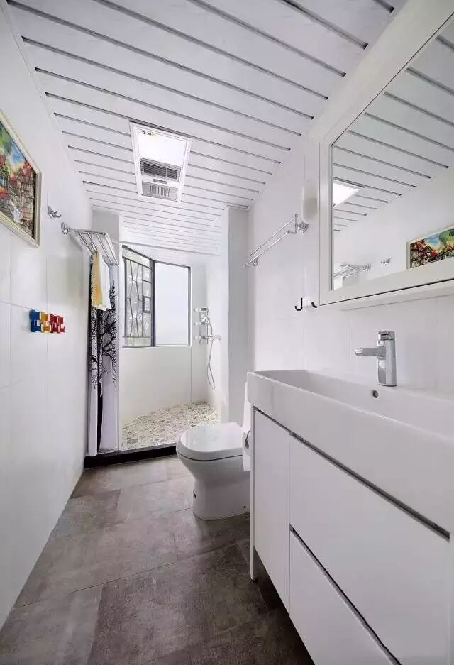 淋浴区是原来的生活阳台,现在把它的一半融入卫生间,扩大了卫生间空间。