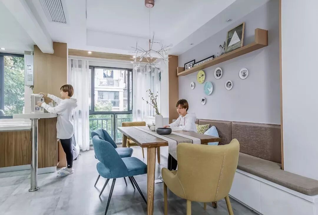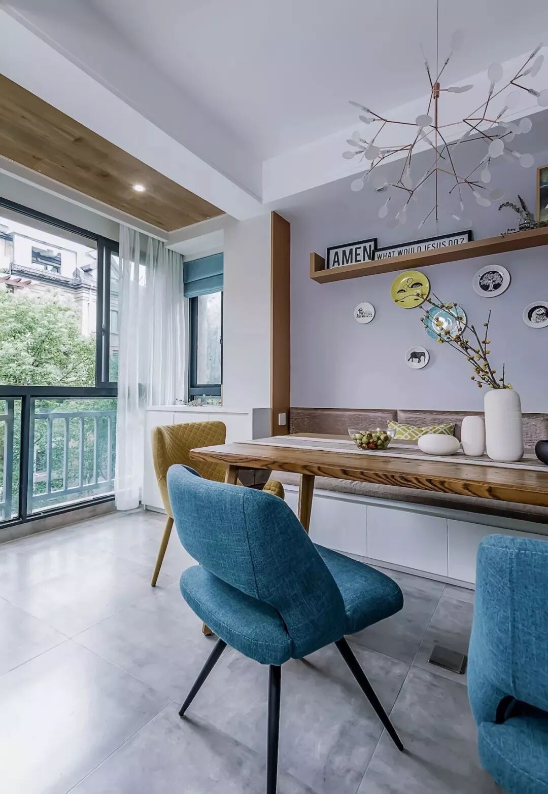 很简约的实木长桌搭配颜色不一的餐椅,更具活泼灵活性。