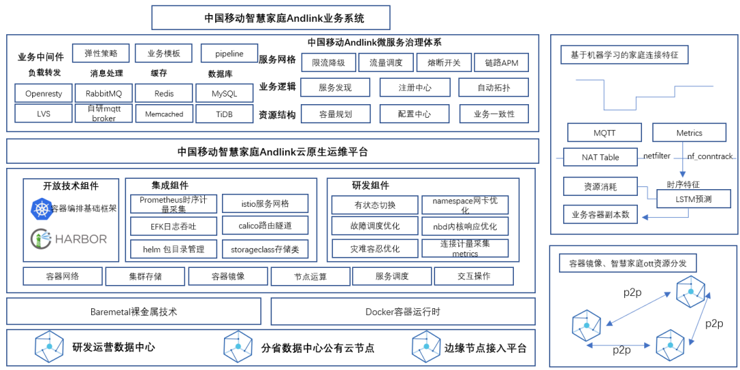 智慧家庭运维平台的整体系统架构中国移动智慧家庭运营中心采用了云原生技术框架,通过“自研+技术共建”的模式,引入火山引擎的云原生技术团队进行技术支撑,在业务系统中实现了 DevOps 流水线、业务容器镜像和研发环境资源的统一管理。目前,该平台已实现大跨度地域资源协同联动管理和使用可计量管理,也实现了全国范围内的智能设备连接管理系统的全容器化承载。通过对云原生技术的深度使用以及火山引擎的云原生技术最佳实践,双方为运维平台打造了诸多创新点,例如:通过容器镜像技术,构建统一应用环境;通过镜像分层和精简技术,中国移动智慧家庭运营中心实现了 OTT 资源等文件的低成本分发;基于服务网格技术,实现了精细化的系统灰度发布、蓝绿发布功能,相较传统运维发布模式而言,新方案节省了大量逐个或批量修改负载均衡器配置、依次重启业务进程用以加载更新后的配置文件等运维操作成本,也大大降低了误操作风险。在边缘系统,中国移动智慧家庭运营中心引入火山引擎边缘计算技术方案,创新性的打造了边缘运维平台,负责管理各个边缘节点的 IT 资源,接受当地管理系统或人员的作业调度或统一管理平台的远程作业,对下沉业务进行更新发布切流等操作。该方案比传统运维平台更好地实现了对全国范围内海量智慧家庭设备连接的管理。此外,“智慧家庭云原生运维平台”还结合机器学习技术,对边缘节点实现了智能节能管理,为 AI 在后续业务场景中落地提供了可能性。