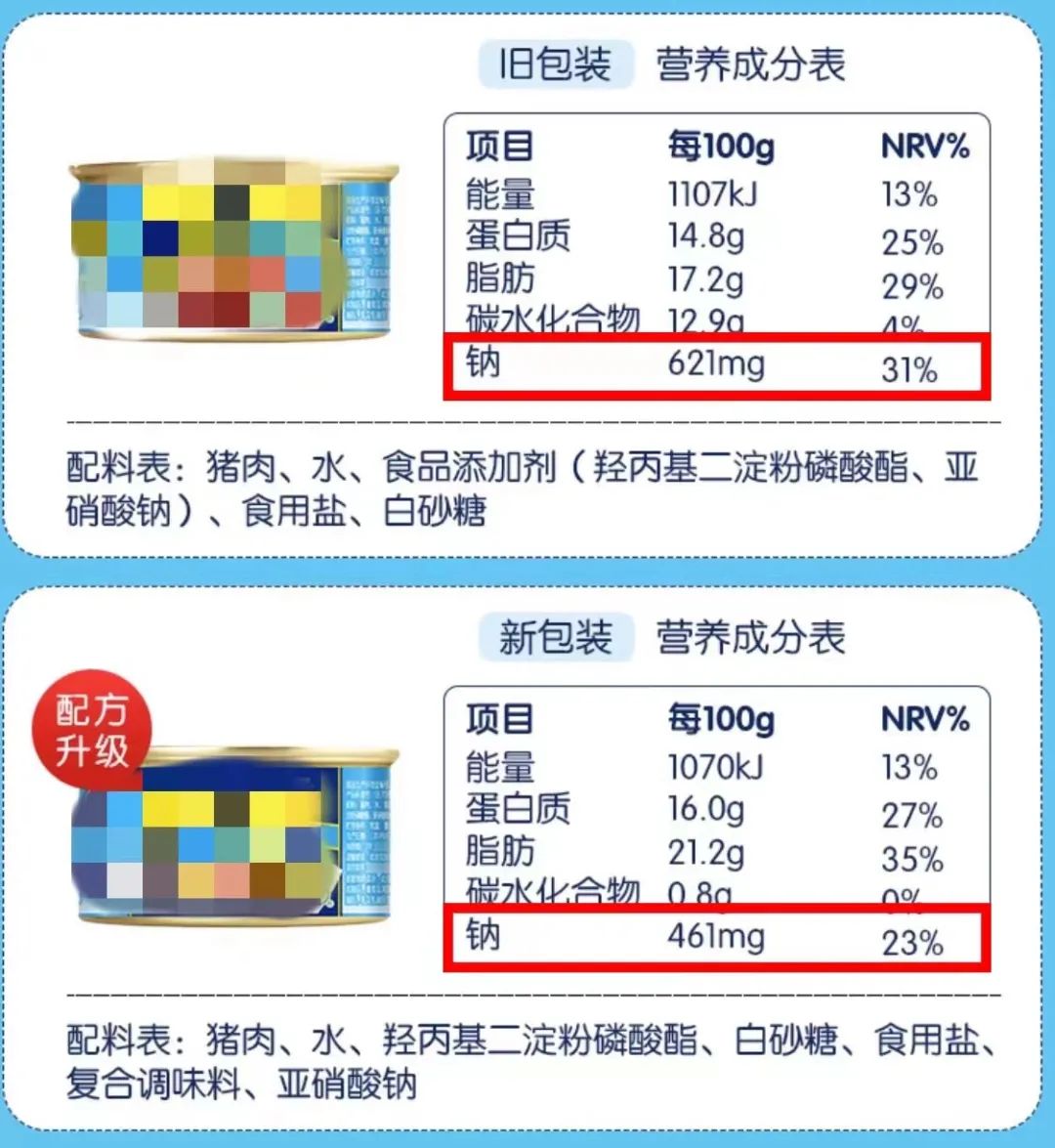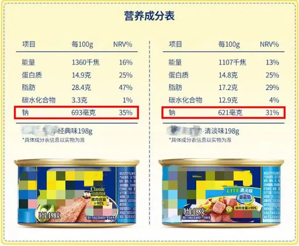 如何为消费者提供真正的低钠午餐肉,食品工程师们其实也很头疼。不过现在我们已经能够看到在某些产品最新的淡盐版本里,配方有了改变,钠含量进一步降低了。期待以后技术不断进步,能逐渐改善这个问题吧~