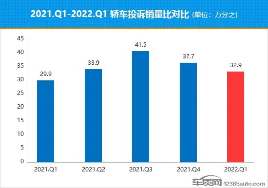 据国内领先的缺陷汽车产品信息收集平台车质网数据显示,2022年一季度共受理国内轿车投诉量累计为13,241宗,乘联会数据显示同期国内轿车(除进口车)销量约为259万辆。除进口车型外,一季度有销量数据支撑的轿车共有207款,为确保数据的准确性,车质网本次只统计这207款车型的首次投诉案例,计算得出2022年一季度轿车投诉销量比均值为万分之32.9,数值较2021年四季度的万分之37.7明显下降,整体投诉销量比表现呈现持续向好态势。
