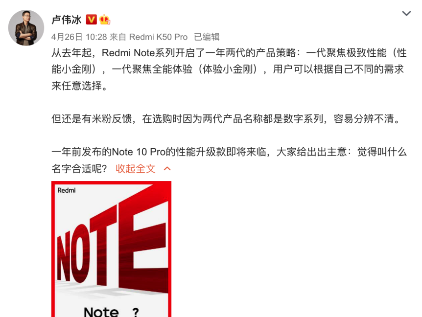 也就是说,全新的Redmi Note系列手机将被称为Redmi Note 11T,而不是以往被多次提到的Redmi Note12。按照Redmi品牌总经理卢伟冰的说法,Redmi Note系列采用一年两代的产品策略,一代聚焦极致性能(性能小金刚),一代聚焦全能体验(体验小金刚)。而更改名字则是为了让用户更容易分辨,根据自己不同的需求来任意选择。