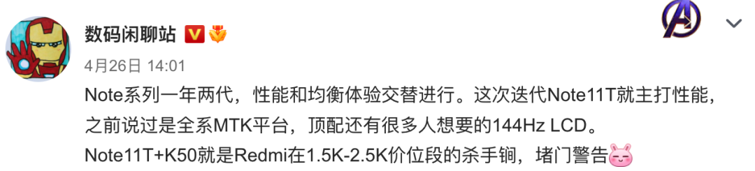 据悉,博主@数码闲聊站 曾在消息中提到,“Note系列一年两代,性能和均衡体验交替进行。这次迭代Note11T就主打性能,之前说过是全系MTK平台,顶配还有很多人想要的144Hz LCD。Note11T+K50就是Redmi在1.5K-2.5K价位段的杀手锏,堵门警告”。