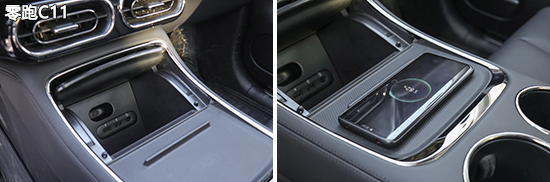 零跑C11全车共设计有9个储物格,虽然数量不多,但是每个储物格的位置设计都很合理。前排水杯架正前方配有一个带防滑垫的平板,并支持手机无线充电,此外这部分区域还配有带盖板的储物槽,内部容积表现不错。后排储物数量较少,除后门板储物槽和中央扶手水杯架外,再无储物的地方,就连前排座椅后置物袋也没有配备,略有遗憾。